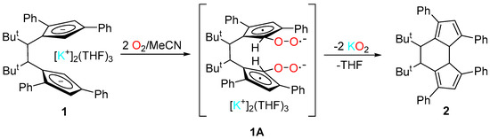 The direct reaction of triplet O2 with cyclopentadienyl rings has not been a frequently used tool in synthesis, aside from the construction of the important cyclopentadienone ligand from highly substituted cyclopentadienyl precursors [1]. Scattered reports from the literature describe the interaction of triplet O2 with cyclopentadienyl-M and mixed (cyclopentadienyl)(arene)-M compounds to give substituted π-(cyclopentadiene)M(η-cyclopentadienyl) complexes [2], as well as both stable and unstable metal cyclopentadienyl [3] and metal arene peroxidic dimers [4,5,6]. The formation of a peroxide bridge between the exocyclic C atoms of coordinated diphenylfulvene (dpf) ligands by exposure of [Rh(dpf)2]+ to O2 has also been observed [7]. In one noteworthy case, the O2-induced dimerization of substituted η5-cyclopentadienyliron(I) η6-arene complexes in pentane occurred via the intermolecular formation of a C-C bond between the arene rings [4]. In our investigation of the oxidation of the 2C-atom-bridged dicyclopentadienyl K+ salt, ansa-[(CHBut)2(Ph2C5H2)2]K2(THF)3 1 [8], we observed an intramolecular cyclopentadienyl ring C- to ring-C bond formation, resulting in the formation of 4,5-di-tert-butyl-1,3,6,8-tetraphenyl-4,5,8a,8b-tetrahydro-as-indacene (2, Scheme 1). Herein, we report the synthesis and molecular structure of 2, obtained by single-crystal X-ray crystallography. To our knowledge, this is the first example of the triplet O2-mediated intramolecular C-C bond formation between cyclopentadienyl rings to give a substituted tetrahydro-as-indacene molecule.