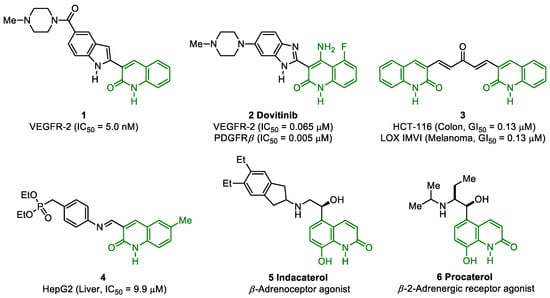 - Xing, G.; Zhi, Z.; Yi, C.; Zou, J.; Jing, X.; Woo, A.Y.-H.; Lin, B.; Pan, L.; Zhang, Y.; Cheng, M. 8-Hydroxyquinolin-2(1H)-one analogues as potential β2-agonists: Design, synthesis and activity study. Eur. J. Med. Chem. 2021, 224, 113697. [Google Scholar] [CrossRef] [PubMed]