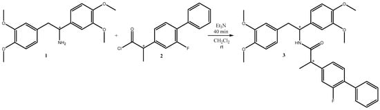 3.2. Synthesis of (±)-N-(1,2-Bis(3,4-dimethoxyphenyl)ethyl)-2-(2-fluoro-[1,1′-biphenyl]-4-yl)propanamide 3