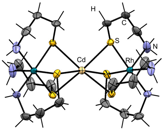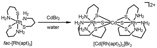During the past decades, cadmium(II) compounds with thiolate ligands have attracted attention due to their structural versatility and structural similarity with the active center of metallothioneins [,]. Organic thiolates are often used for constructing homometallic thiolato cadmium(II) complexes. On the other hand, heterometallic polynuclear complexes have been rationally synthesized from metal complexes containing aminothiolate ligands in combination with cadmium(II) ions [,]. For example, it has been reported that the reaction of fac-[Rh(aet)3] (aet = 2-aminoethanethiolate) with Cd2+ forms a T-cage-type octanuclear complex, [Cd4O{Rh(aet)3}4]6+, in which four fac-[Rh(aet)3] units surround a tetrahedral {CdII4O}6+ core in a bridging coordination mode []. However, the number of this class of polynuclear cadmium(II) complexes is still limited.