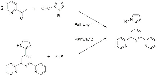 There are some examples of terpyridine–pyrroles which are modified to the N-atom of the pyrrole unit [5,6,7]. To date, they are prepared via two synthetic strategies (Figure 1):