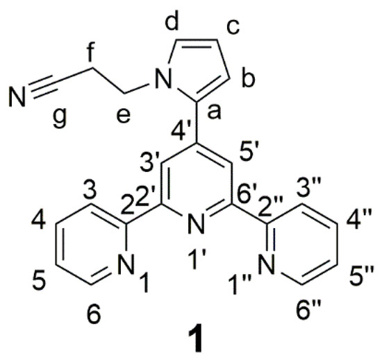 The structure of the product was confirmed via 1H and 13C NMR, attenuated total reflectance infrared spectroscopy (ATR-IR) and high-resolution mass spectrometry (HR-MS). The proton spectrum (Supplementary Materials) exhibits characteristic signals for terpyridine–pyrrole compounds. Furthermore, the aliphatic part of the molecule (protons He and Hf) appears as two triplets as expected. Additionally, the 13C NMR spectrum exhibits 15 peaks, as anticipated for compound 1.