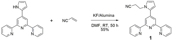 The title compound was prepared through the reaction of 4′-(pyrrol-2-yl)-2,2′:6′,2″-terpyridine [6,10] with acrylonitrile, according to a protocol that has previously been used for the preparation of pyrrole derivatives [11]. It relies on an aza-Michael addition reaction, which is catalyzed via potassium fluoride to alumina (KF/alumina) and is performed at room temperature in dimethylformamide as solvent (Figure 3). After 50 h, no further reaction was noticed, and the product was separated from the starting material via flash chromatography over neutral alumina.