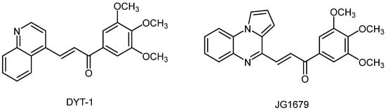 We previously published a series of new pyrrolo[1,2-a]quinoxaline derivatives endowed with promising pharmacological activity towards human leukemia cells [16,17,18,19,20,21]. In this context, and as an extension of our research work on the development and assessment of new antiproliferative heterocyclic derivatives, we decided to further modulate and substitute our heterocyclic pyrrolo[1,2-a]quinoxaline pharmacophore. DYT-1, a substituted quinoline, was recently screened from a chemical library and identified as a hit compound active against several leukemia [23,24]. Consequently, taking into account the experience of our lab in the domain of the synthesis of new bioactive nitrogen heterocyclic compounds based on this pyrrolo[1,2-a]quinoxaline heterocyclic scaffold, we report herein the design, synthesis and structural identification of (E)-pyrrolo[1,2-a]quinoxalin-4-yl)-1-(3,4,5-trimethoxyphenyl)prop-2-en-1-one (JG1679) that could be considered a new structural bioisostere analogue of the previously described bioactive quinoline DYT-1 compound (Figure 1). This novel substituted pyrrolo[1,2-a]quinoxaline derivative JG1679 is then tested against four leukemia cell lines, namely, MV4-11, K562, Jurkat and MOLM14.