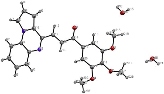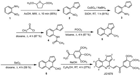The preparation of (E)-pyrrolo[1,2-a]quinoxalin-4-yl)-1-(3,4,5-trimethoxyphenyl)prop-2-en-1-one (JG1679) has been accomplished in six steps starting from the commercially available 2-nitroaniline 1 according to the sequence depicted in Scheme 1. The Clauson-Kaas reaction of commercially available 2-nitroaniline 1 with 2,5-dimethoxytetrahydrofuran (DMTHF) in refluxing acetic acid under microwave conditions gave phenylpyrrole 2, which was then reduced using a NaBH4-CuSO4 treatment to provide 1-(2-aminophenyl)pyrrole 3. The reaction of acetyl chloride with 3 led to acetamide 4. 4-methylpyrrolo[1,2-a]quinoxaline 5 was prepared via the cyclisation of this amide 4 in refluxing phosphorus oxychloride according to the Bischler–Napieralski reaction. Then, we synthesized pyrrolo[1,2-a]quinoxaline-4-carboxaldehyde 6 via the oxidation of 5 with SeO2 in refluxing dioxane. Finally, aldehyde 6 reacted with 3′,4′,5′-trimethoxyacetophenone under the presence of an aqueous NaOH solution, resulting in the synthesis of compound JG1679 as a single E isomer [23]. Thus, a coupling constant value of 15.15 Hz was in favor of a trans configuration in the double bond. The structure of this original synthesized pyrroloquinoxaline derivative JG1679 was then corroborated by FTIR, 1H/13C-NMR, X-ray and ESI-MS experiments (see Supplementary Materials, Figures S1–S4). The 3D structural determination of this new substituted pyrrolo[1,2-a]quinoxaline JG1679 was established by X-ray crystallography (Figure 2) [25], and the confirmation of the structure being in the solid state was anticipated on the basis of NMR analysis.
