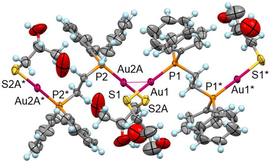 Diffraction data for the title compound 1 were recorded on a Rigaku XtaLAB Synergy Custom X-ray diffractometer equipped with a Hypix-6000HE hybrid photon-counting detector and a Rigaku VariMax rotating-anode X-ray source with a Mo target. The intensity data were processed using the CrysAlisPro program (version 1.171.41.122a) and collected using the ω-scan technique. The structures were solved by direct methods using SHELXS [45], and refined by SHELXL [45] using the Olex2 program [46]. H atoms were placed at the calculated positions and refined isotropically, while non-hydrogen atoms were refined anisotropically. The H2tg ligands, dppe ligands, and gold atoms were positionally disordered over two positions, whose occupancy factors were refined to 0.648 and 0.352. Several DFIX, ISOR, DANG, and RIGU instructions were used to model the disordered parts. The crystallographic data and geometrical parameters of 1 were summarized in Figures S1 and S2.