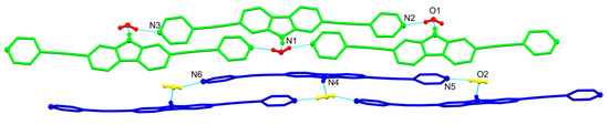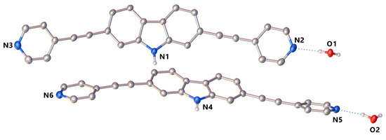 The two symmetry-independent carbazole molecules are nearly planar, with the terminal pyridyl rings rotated by angles ranging between 3° and 25°. It is worth noting that the rotational barrier for pyridyl groups in similar derivatives was calculated to be a few kcal·mol−1 [11,14], suggesting that the overall conformation adopted by the donor in the solid-state is likely to be easily modulated and governed by supramolecular interactions.
