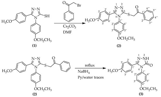 2-((4-(4-Ethoxyphenyl)-5-(4-methoxyphenyl)-4H-1,2,4-triazol-3-yl)thio)-1-phenylethan-1-one (2) was synthesized using an S-alkylation reaction of the 4-(4-ethoxyphenyl)-5-(4-methoxyphenyl)-4H-1,2,4-triazole-3-thiol (1). Initially, the scope of the present work was to synthesise a secondary racemic alcohol from the aforementioned ketone by reduction of carbonylic functional group using sodium borohydride. Therefore, a modified procedure from the literature was applied for the reduction reaction. The synthesis followed Scheme 1: