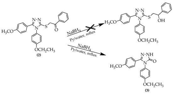 For the reduction of the obtained ketone, sodium borohydride was chosen as the reduction agent, following modified literature procedures []. An excess of the borohydride was used to compensate for the eventual loss of reduction agent by decomposition or secondary reactions. Surprisingly, the reduction reaction did not produce racemic secondary alcohol, but rather a different compound (3). First, it possessed an unusually high melting point, which is not characteristic of similar secondary racemic alcohols. From NMR and later HRMS data, it was concluded that the obtained compound carries a ketone functional group but it is directly attached to the triazole ring. At first sight, it appears that the reaction of heterocyclic thioketones with sodium borohydride in the pyridine/water mixture at reflux temperature leads to the formation of triazolone (3) instead of the secondary alcohol. A first conclusion is that instead of the reduction of carbonyl group, a nucleophilic substitution of the alkylsulphanyl functional group by the hydroxyl functional group in the basic medium took place. More research in this direction is required to elucidate the real mechanism of the reaction. It is not clear what effect the alkyl substituents or reaction conditions (temperature, solvent, etc.) have on the triazolone formation rate. In Scheme 2, the expected and actual reaction paths are represented.