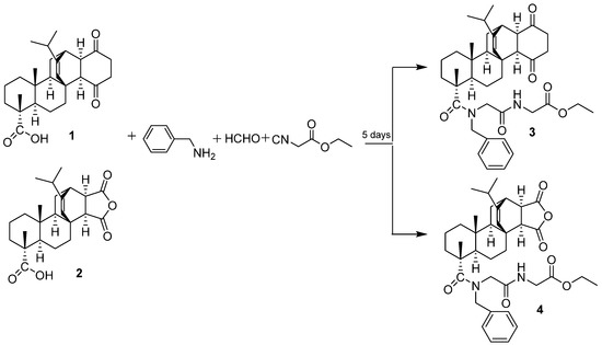 Paraformaldehyde (0.03 g, 1 mmol) was suspended in 10–20 mL dry methanol, followed by the addition of benzyl amine (0.13 g, 1.2 mmol). The suspension was stirred for 2 h at room temperature. Then, 1 mmol diterpenic acid 1 (0.41 g) or 2 (0.40 g) and the ethyl 2-isocyanoacetate (0.11 g, 1 mmol) were added, and the solution was stirred for an additional 5 days. The reaction mixture was poured into aqueous HCl (2 M) and the precipitate formed was filtered off, washed until neutral, and dried in air. The residue was purified via column chromatography using petroleum ether: ethyl acetate (10:1→3:1) as eluent.
