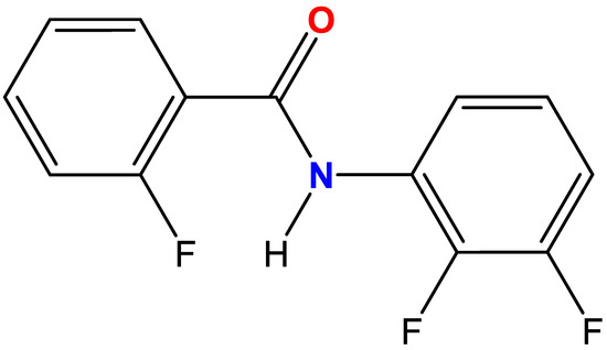 Benzamides continue to attract considerable research attention (and especially in structural science) as a key area in the much wider field of amide research [1,2,3,4,5]. Consequently, benzamides have seen applications in organic synthesis and pharmaceuticals, and through biopolymers and biochemistry [1,2,3,4,5]. Therefore, in terms of amide-based structural chemistry, the exponential increase in organic (bio)materials and pharmaceuticals has been noted in the literature and as archived on databases such as the Cambridge Structural Database (CSD) [3]. Fluorine derivatives continue to attract extensive attention in medicinal chemistry and pharmaceuticals, with the on-going development of new drugs and therapies [6,7]. Fluorinated benzamides, carboxamides and their structures, both solid-state and gas-phase, have been investigated over the past three decades [3,8,9,10,11,12,13]. The advances in structural research are reflected in the huge increase in published and archived benzamide datasets [3,8,9,10,11,12,13]. Of further note is our experience with both halogenated benzamides and carbamates. The crystallization of benzamides tends to be easier and form better quality single crystals compared to the carbamate analogues. The additional -O- spacer in the central OCONH gives additional flexibility to the carbamates in solution, perhaps ultimately contributing to poorer crystal growth [12,14].