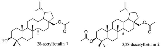 Chemical synthesis is a method of obtaining new semi-synthetic betulin derivatives. The reaction of betulin with acetic anhydride leads to two products, i.e., 28-acetylbetulin 1 and 3,28-diacetylbetulin 2 (Figure 1). The yield of substances 1 and 2 depends on the conditions of this synthesis [,].