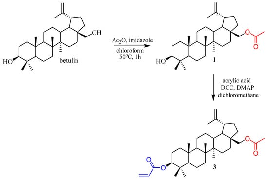 The chemical structure of 28-O-acetyl-3-O′-(prop-2-enoyl)betulin 3 was established with NMR, IR spectroscopy, and mass spectroscopy (EI MS, HRMS).