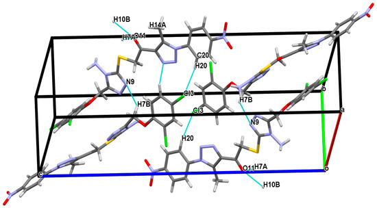 Figure 2 shows that the structure is stabilized by hydrogen bonds between the carbon atom and the nitrogen, oxygen, and chlorine atoms, as follows: C7—H7B---N9, C7—H7A---O11, C10—H10B---O11 and C20—H20---Cl3 together. Beautiful parallel networks with a wavy pattern could be seen in the crystal packing (Figure 3).