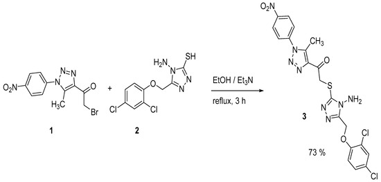 The heating under reflux conditions of 2-bromo-1-(5-methyl-1-(4-nitrophenyl)-1H-1,2,3-triazol-4-yl)ethan-1-one (1) with 4-amino-5-((2,4-dichlorophenoxy)methyl)-4H-1,2,4-triazole-3-thiol (2) in absolute ethanol in the presence of triethyl amine as catalyst gave 2-((4-amino-5-((2,4-dichlorophenoxy)methyl)-4H-1,2,4-triazol-3-yl)thio)-1-(5-methyl-1-(4-nitrophenyl)-1H-1,2,3-triazol-4-yl)ethan-1-one (3) in 73% yield (Scheme 1). Crystallization of the solid obtained from dimethylformamide (DMF) gave 3 in crystal form.
