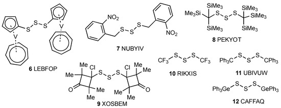 Examples of previously reported structurally characterised symmetrical trisulfanes with CSD Refcodes.
