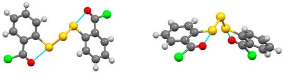 In the hope of being able to determine the structure of 1 by X-ray diffraction, small crystals obtained in a separate experiment, by cooling a saturated solution of 2 in thionyl chloride, were examined and, quite unexpectedly, these proved to be the symmetrical trisulfane: 2,2′-trisulfanyldibenzoyl chloride 5 (Figure 1). It should be noted that this compound was obtained in very low yield, meaning that no physical or spectroscopic data could be recorded, but the structure obtained shows some interesting features.