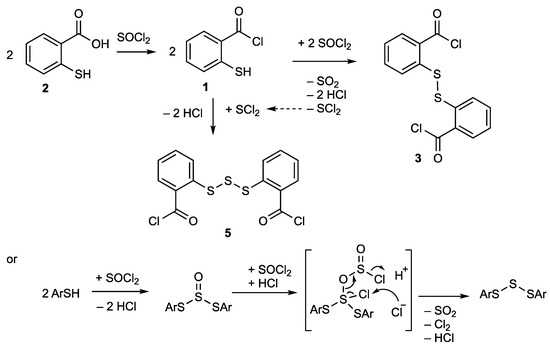 Despite its low yield, the mechanism by which compound 5 was formed is of some interest. We have been able to find two literature precedents for such a process. In the most similar case, 1,2-dihydro-2-thioxopyridine-3-carboxylic acid (which can be formulated as 2-mercaptopyridine-3-carboxylic acid and is, thus, the direct aza analogue of 2) reacts with thionyl chloride to give a mixture of di- and tri-sulfanediyldiacid chlorides [20]. In the other, a range of substituted thiophenols react with thionyldiimidazole to give mixtures of diaryl disulfides and diaryl trisulfides [21]. With these processes in mind, we suggest that the formation of 5 may involve either oxidative coupling of 1 under the influence of thionyl chloride to give 3 and sulfur dichloride, which then reacts with 1 to give 5 (Figure 5); or, alternatively, it may proceed via stepwise formation of the trisulfane 2-oxide, which is then deoxygenated with concomitant formation of chlorine.