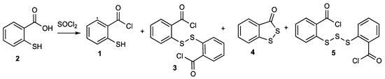 Prior to distillation, additional signals were present in both the 1H and 13C NMR spectra, indicating the presence of 2,2′-dithiodibenzoyl chloride 3 [6,7].