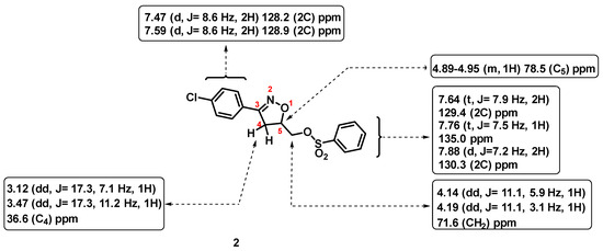 The structure of isoxazoline sulfonate (5) was fully characterized by FT-IR, 1H NMR, 13C NMR and ESI+-MS spectroscopies, and confirmed by single-crystal X-ray diffraction (See Figures S1–S4 in Supplementary Materials (SM) Section). As illustrated in Figure 1, the 1H NMR spectrum of (5) showed two doublets of doublets at 3.47 and 3.12 ppm corresponding to the two protons of the CH2-isoxazolinic as well as two doublets of doublets at 4.14 and 4.19 ppm for the O-CH2 protons. Furthermore, we detected the presence of a multiplet centered at 4.92 ppm illustrating the H-isoxazolinic proton. Then, the region between 7.47 and 7.88 ppm showed the signals of the different aromatic protons. The 13C NMR spectrum exhibited three blinded signals at 36.6, 71.6 and 78.5 ppm, corresponding to CH2-isoxazoline, O-CH2 and CH-isoxazoline and signals at 156.3, 135.5, 135.3, 135.0, 130.3 (2C), 129.4 (2C), 128.9 (2C), 128.3 and 128.2 (2C), attributed to all the aromatic carbons.