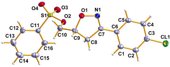 X-ray intensity data were collected at 150 (2) K. Using APEX4 [28], the structure was solved via Intrinsic Phasing in the SHELXT [29] structure solution program and refined using the Least Squares minimization in the SHELXL [30] refinement package. With one molecule in the asymmetric unit, [3-(4-chlorophenyl)-4,5-dihydroisoxazol-5-yl]methyl benzenesulfonate crystallizes in the orthorhombic space group Pbca (Figure 2).