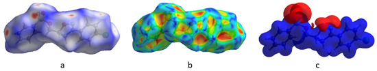 Crystal Explorer 17.5 [31,32,33] was used to conduct a Hirshfeld surface (HS) analysis in order to see how [3-(4-chlorophenyl)-4,5-dihydroisoxazol-5-yl]methyl benzenesulfonate interacts with other molecules in the crystal. As shown in Figure 3a, the blue- and red-colored surfaces in the HS plotted over dnorm denote contacts with distances that are longer (distinct contact) or shorter (in close contact), respectively, whereas the white color denotes connections with distances equal to the sum of the van der Waals radii. The most important red spots and the corresponding interactions are shown in Figure S8 (See SM). The shape-index (Figure 3b) generated in the range of −1 to 1 Å shows that there are no π–π interactions, normally indicated by adjacent blue and red triangles. The sites of intimate intermolecular contacts in the compound are clearly visible in the potential electrostatic calculated utilizing the STO-3G basis, which are mapped on the Hirshfeld surface throughout the range of 0.05 a.u. and set at the Hartree–Fock level of theory (Figure 3c). Positive potential electrostatic (blue zone) over the surface denotes hydrogen-donor potential, whereas negative electrostatic potential (red region) denotes hydrogen-bond acceptors.
