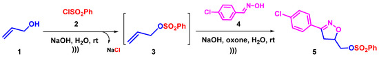 Inspired by our previous works [26,27], the one-pot synthesis of our product (5) started with the sulfonylation of equimolar equivalents of allylic alcohol (1) and benzene sulfonyl chloride (2) in water with NaOH as a base at 25 °C under sonication to produce the corresponding dipolarophile (3) in situ. Subsequently, in the second step, the alkene sulfonate (3) reacted with p-chlorobenzaldoxime (4) via 1,3-dipolar cycloaddition using NaCl as a precatalyst generated from the first step and oxone as a terminal oxidant to successfully generate the expected (3-(4-chlorophenyl)-4,5-dihydroisoxazol-5-yl)methyl benzenesulfonate (5) as white crystals at a 85% yield (Scheme 1).