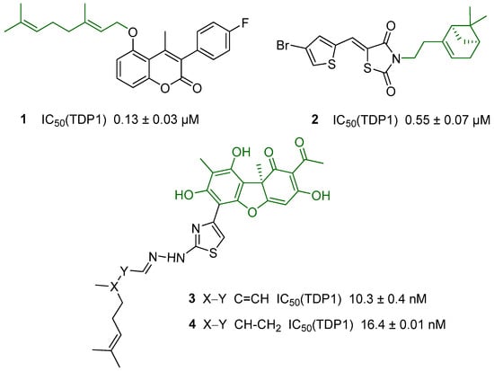 A promising approach to the development of new TDP1 inhibitors is to carry out chemical modifications of natural molecules. Multiple classes of effective inhibitors have been found among derivatives of various plant metabolites (Figure 1). Conjugates of monoterpenoids and 3-arylcoumarins 1 and thiazolidinediones with thiophene and terpene substituents 2 are active in the lower micromolar range. The leaders in inhibitory characteristics are derivatives of usnic acid 3 and 4, which are active in nanomolar concentrations [11].