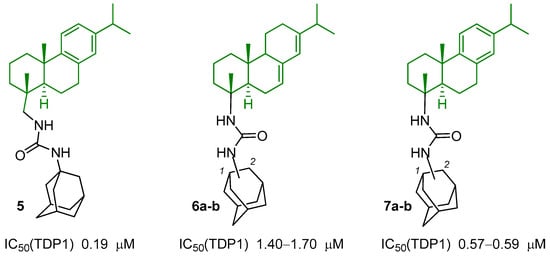 Attractive substance classes for the creation of new TDP1 inhibitors based on them are not only derivatives of dehydroabietic acid, but also other resin acids. Previously, our team obtained ureas with nordehydroabietic 6a–b and norabietic fragments 7a–b in the structure (Figure 2) [14]. The influence of the type of attachment of the adamantane fragment—in the first or second position of the scaffold—was studied. These compounds showed the ability to inhibit the DNA repair enzyme TDP1 in micromolar and submicromolar concentrations. However, further cellular experiments to study their cytostatic properties individually and in combinations could not be carried out due to their low solubility in water and organic solvents. To increase the solubility and bioavailability of certain classes of substances, a bioisosteric replacement of the ureide group with an imidazolidine-2,4,5-trione group can be used [15].