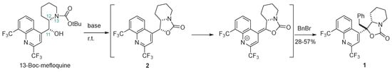 Carbamate-protected mefloquine [] was applied in the etherification reaction with benzyl bromide. The reaction was inefficient without a base, even at elevated temperatures. Conducting a similar reaction at room temperature but in the presence of KOH as a base resulted in an unexpected C-benzylated product 1 in a low yield (28%). Upon changing the base to sodium hydride, the same product 1 was obtained in moderate yield (57%, Figure 1, Table 1). The reaction with methyl iodide instead of benzyl bromide did not progress to incorporate a methyl group and instead delivered the known oxazolidinone 2 []. Oxazolidinone 2 was also formed in attempted Mitsunobu reactions of Boc-mefloquine.