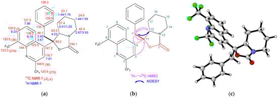 (a) NMR spectral assignment; (b) non-trivial 1H,13C HMBC and NOESY correlations and atom numbering scheme of parent mefloquine; (c) DFT/B3LYP/6-31G(d,p) molecular model for compound 1.