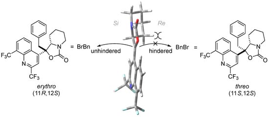 The formation of product 1 must involve intramolecular substitution of tert-butoxide with the 11-alkoxide group to form oxazolidinone 2. This cyclization, though common [], is not consistently observed as a side reaction of Boc-1,2-aminoalcohols under basic conditions [,,,]. The subsequent step likely involves the deprotonation of oxazolidinone due to the strongly electron-withdrawing effect of trifluoromethyl-substituted quinoline []. Deprotonation of lepidine under relatively mild conditions is long known to initiate addition to electophiles []. Finally, the reaction with an electrophile such as benzyl bromide gives the C-alkylated product. Alkylation of oxazolidinone at this position has only been reported once, involving coupling with transition metal organometallics []. On the other hand, coupling reactions of lithiated 4-picoline are better known and proceed more efficiently at a more substituted center with benzyl bromide than with methyl iodide []. Since compound 1 is obtained as a single diastereomer, the approach of the benzyl group must have occurred stereoselectively. To explain the diastereoselectivity, we devised a molecular model of the intermediate anion at the DFT/B3LYP/6-31G(d,p) level. Assuming a 12S configuration, the model demonstrates a nearly flat alignment of the piperidine and oxazolidinone rings, with the remaining part of the piperidine ring protruding from the Re-face. Thus, the preferrable sterically unobstructed trajectory from the Si-face would deliver the observed erythro product 1 (Figure 3).
