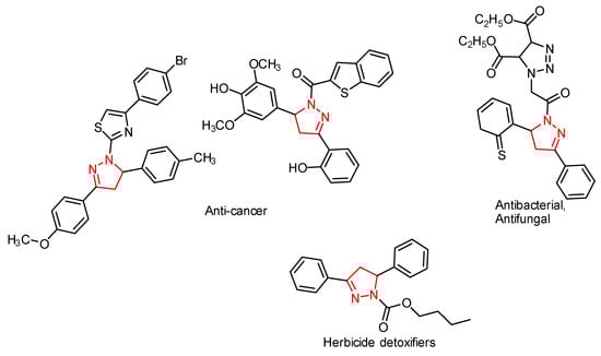 Compounds whose structures are based on a pyrazoline fragment are of particular interest to the pharmaceutical industry as substances with anticancer [1,2,3], antimicrobial and antifungal [1,4] activity and to agriculture as herbicide detoxifiers [5] (Figure 1).