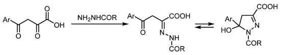 Synthesis of pyrazolines via a reaction of acylpyruvic acids and substituted hydrazines.