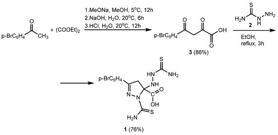 The title compound 1 was synthesized in several stages (Scheme 2). Initially, 4-(4-bromophenyl)-2,4-dioxobutanoic acid 3 was obtained via the Claisen condensation of 4-bromoacetophenone and diethyl oxalate. Then, as a result of the reaction of compound 3 and thiosemicarbazide 2, 3-(4-bromophenyl)-1-carbamothioyl-5-(2-carbamothioylhydrazinyl)-4,5-dihydro-1H-pyrazole-5-carboxylic acid 1, the target compound, was obtained for the first time.