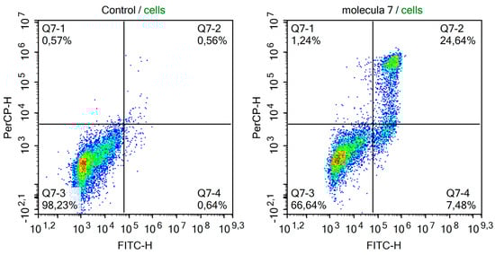 Analysis of apoptosis induction in Jurkat cells during incubation with hybrid molecule 7 at a concentration of 0,5IC50 for 24 h. Annexine Alexa Fluor 488 and 7AAD staining.