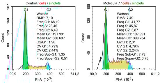 Figure 2 shows histograms of the cell cycle in the cell culture treated with the synthesized compound 7 and the cells of the control sample. Hybrid molecule 7 causes cell cycle arrest in the S phase and also causes the accumulation of the cell population in the G0 phase compared to the control sample.