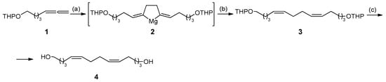 Based on the developed strategy for the total synthesis of (5Z,9Z)-14-[(3,28-dioxoolean-12-en-28-yl)oxy]tetradeca-5,9-dienoic acid, (5Z,9Z)-tetradeca-5,9-dien-1,14-diol (4) was originally synthesized using the newly developed reaction homo-cyclomagnesiation of tetrahydropyran ether of hepta-5,6-dien-1-ol 1 with EtMgBr in the presence of a Cp2TiCl2 catalyst (5 mol %) [56,57,58,59]. Subsequent deprotection of tetrahydropyranyl-5Z,9Z-diene-1,14-diol 3, formed after hydrolysis of magnesacyclopentane 2, in the presence of catalytic amounts of p-toluenesulfonic acid lead to compound 4 (Scheme 1).