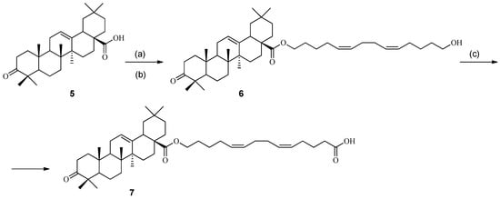 The synthesis of target hybrid molecule 7 based on oleanolic and (5Z,9Z)-tetradeca-5,9-dienedicarboxylic acids was carried out through the reaction of 3-oxoolean-12-ene-28-oic acid with an excess of oxalyl chloride (18 eq.) to obtain the corresponding acid chloride, which then reacted in situ with 1,14-bis-tetrahydropyranyl-5Z,9Z-diene-1,14-diol 4 (2 eq.) in the presence of DIPEA (2.5 eq.) to obtain compound 6, the subsequent oxidation of which with the Jones reagent lead to the formation of dienoic acid 7 (Scheme 2). Please see the Supplementary Figures S1 and S2.