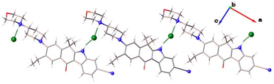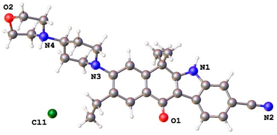 The powder pattern was obtained at room temperature; thus, it can be used in industry for phase identification (Figure S5). It was indexed using Topas 5.0 package [10], which indicates the sample purity. The systematic absences suggested the space group P21/c, which was confirmed by the successful solution and refinement of the structure. A simulated annealing algorithm of Topas 5.0 was applied to find the positions of the non-hydrogen atoms of alectinib and an independent chlorine atom in an asymmetric unit. The Rietveld refinement was carried out to refine the coordinates of all atoms [11]. The asymmetric unit of 1 is depicted in Figure 1. It contains one alectinib molecule and an anion. The morpholine and piperidine rings are in the chair conformation. The condensed cycles are nearly coplanar; the average deviation of the atoms, with an exception of the (CH3)2C fragment, is equal to 0.07(8) Å. The C15 atom of (CH3)2C is situated 0.040(4) Å above the plane of its six-membered ring. Although the positions of the hydrogen atoms cannot be located during the refinement of powder XRD data, the most likely system of H-bonds corresponds to location of the additional H(N) proton on the nitrogen atom of the morpholinyl cycle.