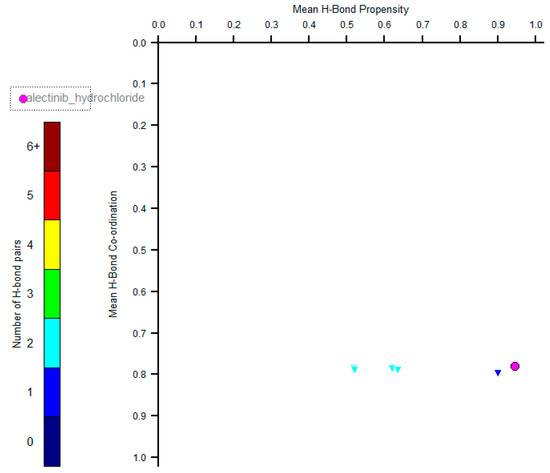 Both acidic H(N) atoms of the five-membered cycle and morpholinyl cycle take part in N–H⋯Cl interactions. The parameters of the H-bonds are listed in Table 1. As both a cation and anion take part in the two hydrogen bonds, infinite H-bonded chains are observed in solid 1. The chains are depicted in Figure 2. Patent [2] contains information about the different polymorphs of alectinib hydrochloride; thus, it is of interest to reveal if type I crystals correspond to a stable or metastable polymorph. The crystal structures of other polymorphs remain unknown; however, the H-bond propensity tool implemented in the Mercury package [12] can be used to estimate if the most likely hydrogen bonds are present in a solid [13,14]. Within this method, it is assumed that the most stable polymorph also contains the most likely hydrogen bonds. Stable polymorphs are characterized by points in the right bottom corner of the H-bond Coordination/H-bond Propensity Plot. In accordance with such calculations, the experimentally observed N–H⋯Cl interactions are more likely than any of the theoretically possible N–H⋯O or N–H⋯N bonds. All donors of H-bonds take part in H-bonding and the solid is characterized by the point in the right bottom corner of the plot (Figure 3). Thus, based on this approach, the system of H-bonds in 1 is the most likely, and the structure is expected to be the most stable polymorph.