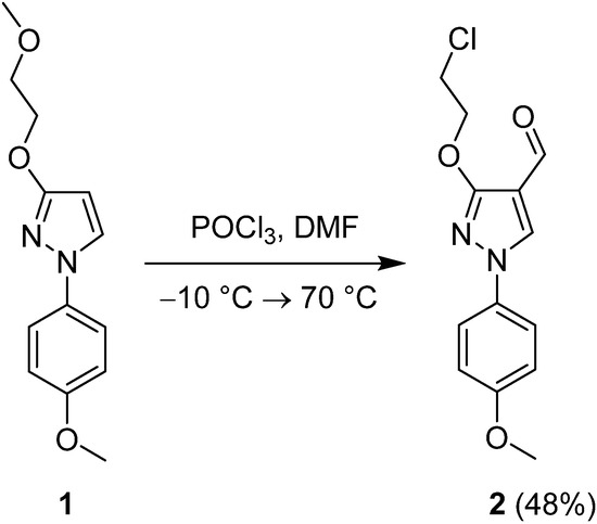 Since phosphorus oxychloride is also known to participate in the Vilsmeier-Haack formylation reaction in conjunction with dimethylformamide, we ought to perform a dual functionalization, namely, to simultaneously formylate, and chlorinate 3-(2-methoxyethoxy)-1-(4-methoxyphenyl)-1H-pyrazole (1) to obtain a (2-chloroethoxysubstituted)pyrazole carbaldehyde 2. The starting material 1 was readily prepared from 1-(4-methoxyphenyl)-3-hydroxy-1H-pyrazole adopting a previously published synthetic method [27]. It was then subjected to the reaction with the Vilsmeier reagent, which has been pre-formed from equimolar amounts of phosphorus oxychloride and dimethylformamide at −10 °C, and then the reaction mixture was heated to 70 °C and stirred for 24 h. After column chromatography, the target compound 2 (Figure 1) was obtained in a moderate yield of 48%.
