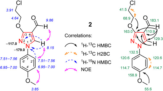 The structure of compound 2 was thoroughly elucidated through NMR spectroscopy (Figure 2). In the 1H NMR spectrum of compound 2 (Figure S1), only one singlet of methoxy group protons appeared at δ 3.85 ppm. Then, according to the 1H-13C heteronuclear single quantum coherence (HSQC) spectrum, these protons had a one-bond correlation with the carbon, which resonated at δ 55.6 ppm. Furthermore, the 1H-13C heteronuclear multiple bond correlation (HMBC) spectrum revealed a correlation between these methoxy group protons and the quaternary carbon at δ 158.9 ppm (phenyl C-4′). The 1H-1H NOESY spectral data revealed that the methoxy group protons exhibited NOEs with the neighboring phenyl group 3′(5′)-H protons (δ 6.95−7.00 ppm), confirming their proximity in space (Figure S3). Thus, it was concluded that only a cleavage of the methoxy group in the 2-methoxyethoxy chain had occurred. The DEPT-135 spectrum clearly showed the negative -CH2 peaks at δ 68.9 and 41.5 ppm (Figure S4); the latter was significantly upfield due to the absence of a neighboring methoxy group. Finally, the most downfield 1H and 13C NMR signals were easily attributed to the formyl moiety via 1H-13C HSQC and HMBC spectral data (Figure S5). The 15N NMR data were obtained through the 1H-15N HMBC experiment where the pyrazole 5-H proton (singlet, δ 8.15 ppm) exhibited long-range correlations with neighboring N-1 “pyrrole-like” (δ −179.0 ppm) and N-2 “pyridine-like” (δ −117.0 ppm) nitrogen atoms (Figure S6).
