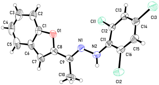The asymmetric unit of the crystal structure constitutes one molecule of 3 (Figure 1). The molecule is composed of three planar fragments, namely, benzofuran (bfn, C1–C8, O1), ethylidenehydrazine (edh, C9, C10, N1, N2), and trichlorophenyl (tcp, C11–C16, Cl1–Cl3) groups. In the molecule, the planes through the planar fragments are twisted relative to each other, with twist angles bfn/edh and edh/tcp of 8.11(13)° and 37.38(7)°, respectively. Intramolecular N–H…Cl contact is observed with an N2–H2B…Cl2 angle of 112(2)° and a N2…Cl2 distance of 2.939(2)°.