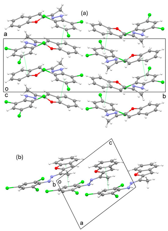 (a) Crystal packing in the structure of 3 viewed down the c-axis and (b) a segment of the crystal structure showing a chain of molecules formed through π…π interactions. The π…π interactions are shown as green dotted lines.