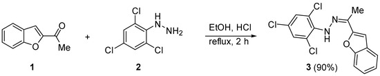 The title heterocycle was synthesized as shown in Scheme 1. The process involved the reaction of equimolar amounts of 2-acetylbenzofuran (1) and 2,4,6-trichlorophenylhydrazine (2) in boiling ethanol (EtOH) containing concentrated hydrochloric acid (HCl, 0.2 mL, 37%) for 2 h. The resulting mixture was allowed to cool, and the solid formed was collected and recrystallized from dimethylformamide (DMF). The title heterocycle, 1-(1-(benzofuran-2-yl)ethylidene)-2-(2,4,6-trichlorophenyl)hydrazine (3), was obtained in a yield of 90% as crystals following crystallization.