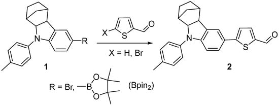 In recent years, solar-to-electricity converters such as organic solar cells have gained significant interest, not only theoretically but also in practice [,]. Using organic materials instead of traditional inorganic ones offers many advantages, such as ease of device manufacture, low cost, universal molecular design, and ease of control over the physical properties of materials [,]. Dye-sensitized solar cells (DSSCs) based on organic dyes are one of the most promising devices for the transformation of solar energy [,]. However, industrial applications of organic solar cells are hampered by issues related to cost, synthesis scalability, and the stability of organic dyes [,,]. Organic sensitizers for DSSCs, as a rule, have a D–π–A-type donor–acceptor structure, in which the acceptor also acts as an anchor during adsorption on the surface of nanocrystalline TiO2 [,]. In this case, the donor (D) and acceptor (A) parts are connected to each other through a π bridge, designed to expand the conjugation chain and increase the distance traveled by the electron during excitation []. Typically, in the synthesis of D–π–A dyes, the last step is the well-known Knoevenagel reaction of D–π–aldehyde with cyanoacrylic acid [,], and Suzuki cross-couplings are most often employed for the preparation of a D–π–aldehyde-type molecule [,]. Therefore, aldehyde synthesis is a key step in the preparation of the sensitizer. Herein, we report the synthesis of 5-(9-(p-tolyl)-2,3,4,4a,9,9a-hexahydro-1H-1,4-methanocarbazol-6-yl)thiophene-2-carbaldehyde 2 as a precursor for the preparation of DSSCs components.