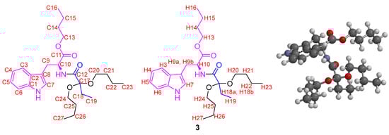 For the H7 and H25 atoms, it is evident that the difference is around 1 ppm. The H7 atom moved to the low field, while the H25 atom appeared at the high field. The differences found can be explained based on magnetic anisotropy and deprotection due to the inductive effect. For the H7 atom, the inductive effect exerted by the hydrogen of the amino group of the indole ring is presumably marked, which is evident as an exchangeable proton, given that its signal in the 1H NMR spectrum is not evident or appears enormously broadened. Thus, the electronic density of the nitrogen atom decreases, possibly due to intermolecular hydrogen bond formation, making the electronic density at the location of the H7 atom lower and causing an increase in the d of this signal. Regarding the H25 atom, magnetic anisotropy is evident such that the local field currents formed from the carbonyl groups protect these fragments, leading to a lower chemical shift. The calculated molecular structure showed a rigidity that leads to an asymmetry around the acetal carbon, so the hydrogen atoms in the methylenes adjacent to this carbon appeared as different and markedly diastereotopic signals. The presence of multiplets instead of multiplied signals, such as well-defined triplets or quartets, supports this hypothesis. Furthermore, the performed calculations showed that the molecular structure of 3 has a point group C1, which is interpreted in terms of symmetry as a model that does not exhibit any rotational symmetry. This molecule does not have an axis of rotation that leaves its structure invariant, indicating the absence of any axis of symmetry, so there is no axis around which the molecule can rotate and make it coincide with itself.