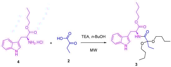 Recently, the reactions between alkyl esters derived from 2-amino acids such as ʟ-tryptophan 1 and 2-ketocarboxylic acids were explored by the Bioorganic Chemistry laboratory [23]. The reaction yields decreased when high-molecular-weight alcohols were used. Microwave irradiation presumably promoted kinetically favored amidation reactions. Small alcohols, e.g., methanol and ethanol, induced a subsequent reaction, forming a hemiacetal compound. When using isopropanol, initial transesterification and amidation occurred, but carbonyl group attack is not favored, preventing the formation of the described hemiacetal. Considering the relevance of this class of compounds, the specificity of its synthesis [24], as well as its potential use as a precursor of various biologically active compounds [25], the synthesis of an unreported acetal-containing compound, i.e., butyl (2,2-dibutoxybutanoyl)-ʟ-tryptophanate 3, is described for the first time in the present study. In addition, the previously reported methodology [23] was revisited, and the influence of the temperature and the reaction time in a model conversion consisting of ʟ-tryptophan 1, 2-oxobutanoic acid 2, and 1-butanol as precursors was investigated, evaluating the role of SiMe3Cl as a catalyst under microwave (MW) irradiation. The results are discussed below.