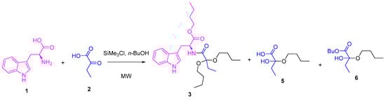 A one-pot methodology was evaluated to improve the yield for compound 3. Thus, mixtures of ʟ-tryptophan 1 and 2-oxobutanoic acid 2 (1 eq:1 eq) in the presence of SiMe3Cl (4 eq) and 1-butanol were heated using MW irradiation at different temperatures, varying the time of reaction (Scheme 2). Other products were detected by 1H NMR of the reaction crudes (Figure 1), which were extracted in each experiment using dichloromethane. The yield of the products depended on the used conditions (Table 2).